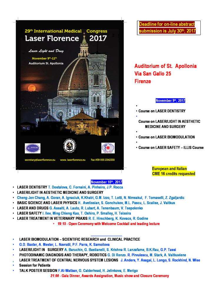 Nel mese di novembre (dal 9 al 12) a Firenze si è tenuta la ventinovesima edizione di Laser Florence. Tale incontro è considerato tra i più celebri eventi nel mondo delle applicazioni laser in campo medico.
